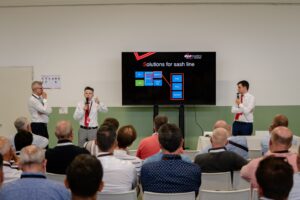 - Complete production line, starting with the V-Perfect welder, followed by total automation for frame production, which includes both frame trimming and hinge assembly.